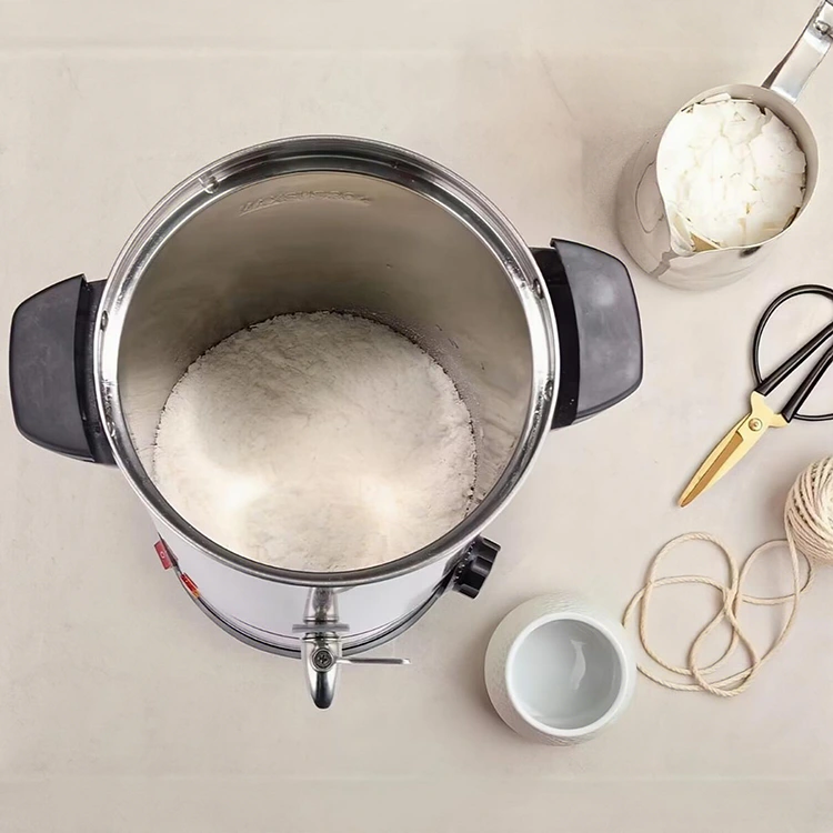 Tarjoamme täyden valikoiman kapasiteettimäärityksiä, mukaan lukien 5L, 8L, 10L, 12L, 15L, 25L, 35L, 45L ja muita vaihtoehtoja, jotka kattavat pienet, keskisuuret ja suuret vahansulatustarpeet. Pienen kapasiteetin (5L-15L) mallit sopivat pienieräisiin tee-se-itse-studioihin ja pienimuotoisiin kynttilänvalmistajiin, vievät vähemmän tilaa ja ovat helposti liikuteltavia; suuren kapasiteetin (25L-45L) mallit on suunniteltu teollisen mittakaavan tuotantoon, ja ne pystyvät sulattamaan suuren määrän vahaa kerralla, mikä parantaa tuotannon tehokkuutta.